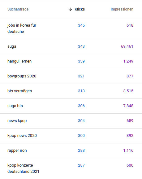 Ich hab jetzt mal ein paar Seiten weitergeblättert, da die erste Seite mit Schlagwörtern ausgestattet ist, die für das Beispiel nicht passen. Dazu zählen ansoko (der Name der Seite), KPOP News und viele Namen von einzelnen Sängern. Ist zwar auch hier der Fall, aber wir haben trotzdem ein paar gute Suchanfragen, die wir nutzen können: